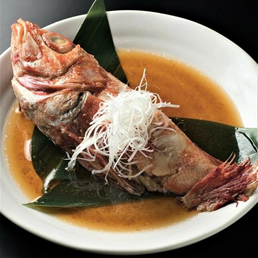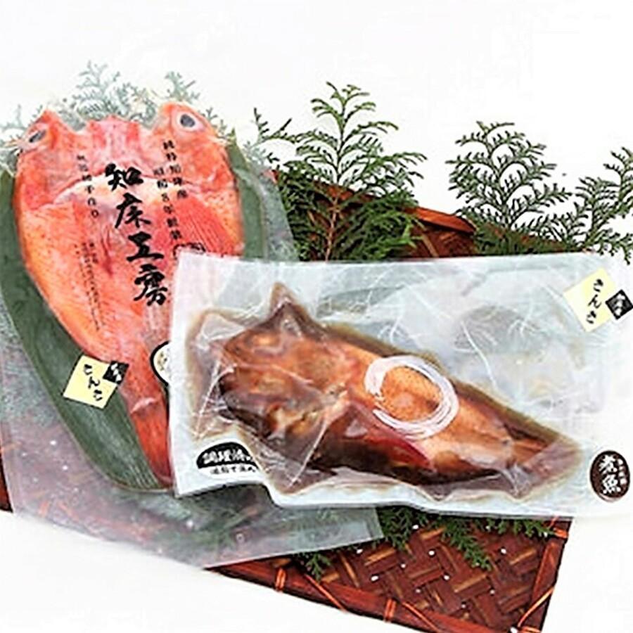 北海道知床、斜里魚菜卸売市場で競り落とした、とれたてで鮮度のよいきんきの一夜干しと姿煮です。北海道ではお正月に鯛のかわりによくこの「きんき」が食卓に上がります。お祝いの魚というイメージが高く、魚体の色も赤です。