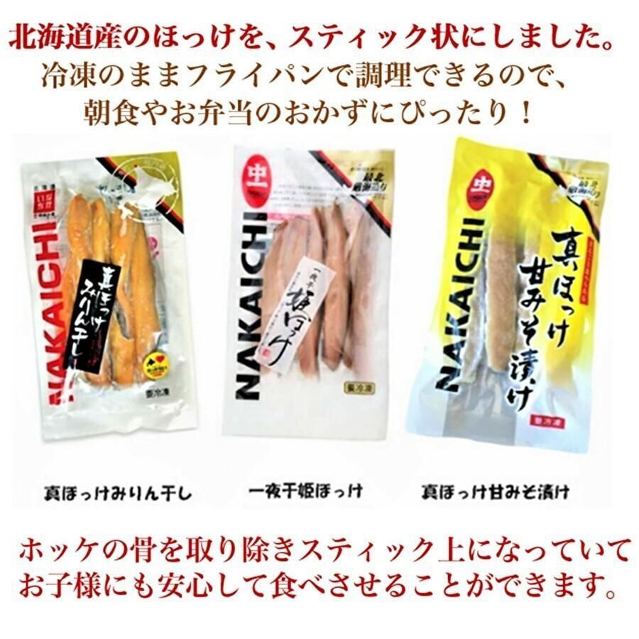 脂乗りの良い時期だけの真ほっけを使用しています。ほっけの半身をスティック状にカットし、北海道産の味噌で甘味噌漬けにしているので、調理も極めて簡単で、忙しい朝にも、美味しく便利に食べられます。