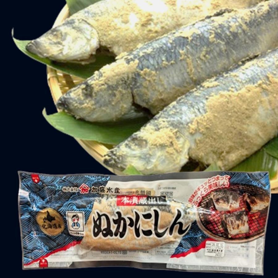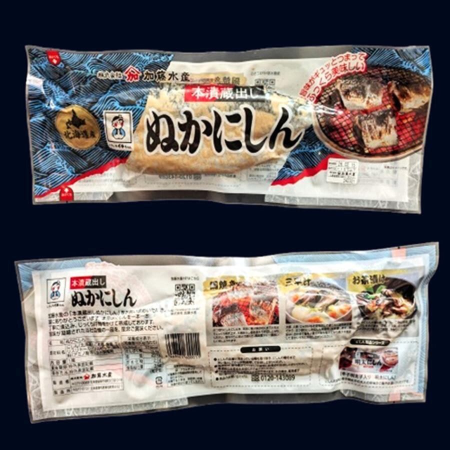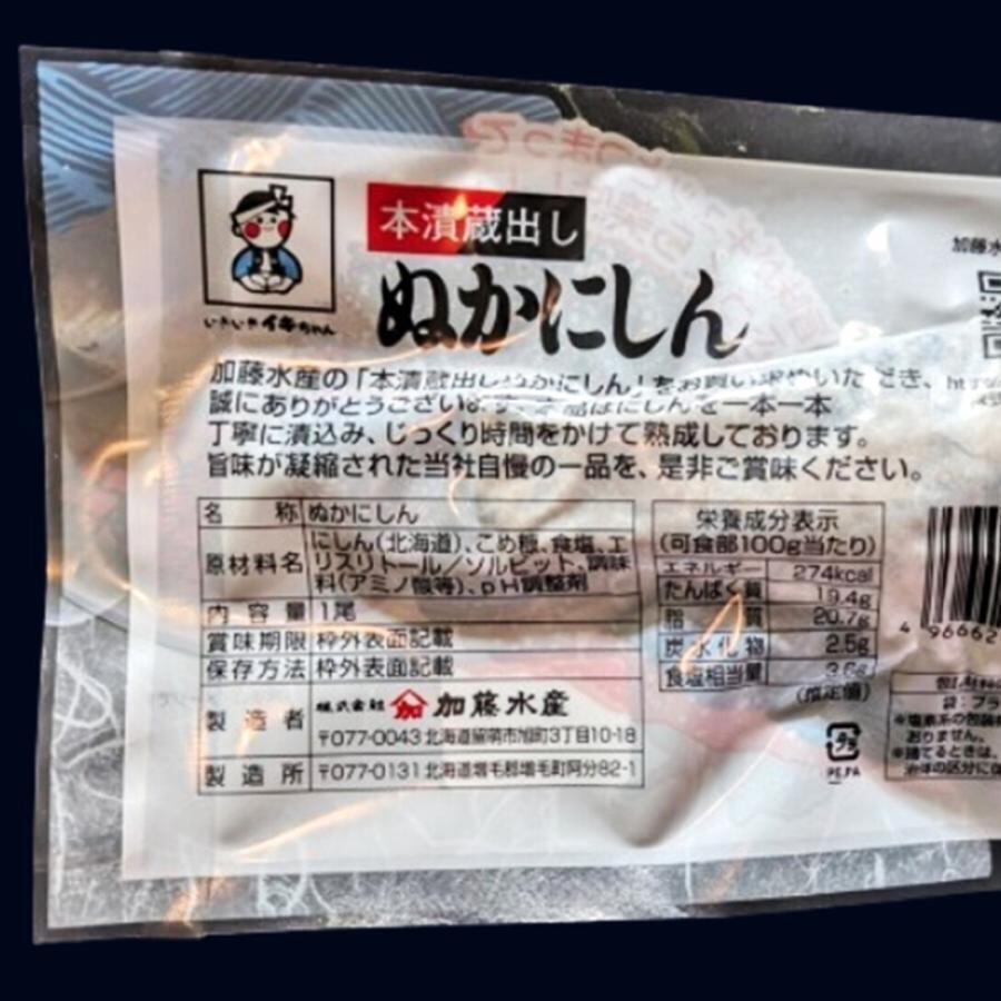 地元北海道で獲れた新鮮なにしんを昔ながらの手法で漬込み、時間をかけて熟成しました。熟練の技で仕上げた糠にしんをご堪能下さい。北海道留萌の加藤水産が作る上質のにしんをじっくりと糠に漬け込んで甘口に仕上げた、人気商品のぬかにしんです。お酒のおつまみにもピッタリです.