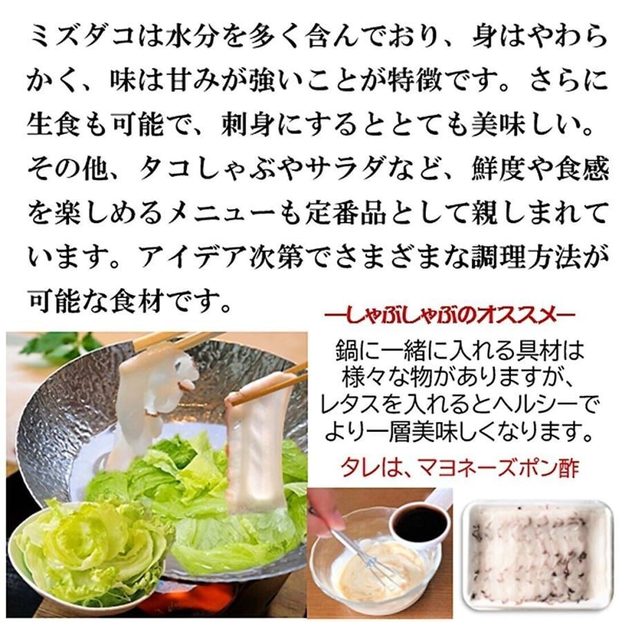 繊維に沿ってうすくカットしているから本当に一枚一枚が柔らかいんです。北海道宗谷の豊富な栄養分がある極寒の海で育った水ダコは、甘みがのっていてプリップリ♪ さっとお湯にくぐらせると外側はプリップリの食感で、中は新鮮な活蛸のやわらかい食感と甘みがトロけちゃう美味しさです。高級料亭でも使われるほどの味と品質です。