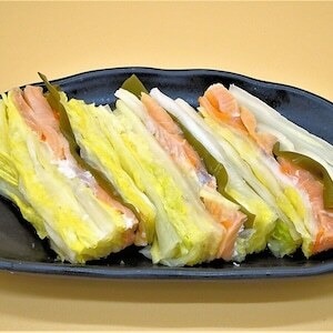 宗谷沖で獲れた新鮮な鮭を1度山漬けし、酢で〆て白菜の間に挟み込みました。甘口の糀漬けです。