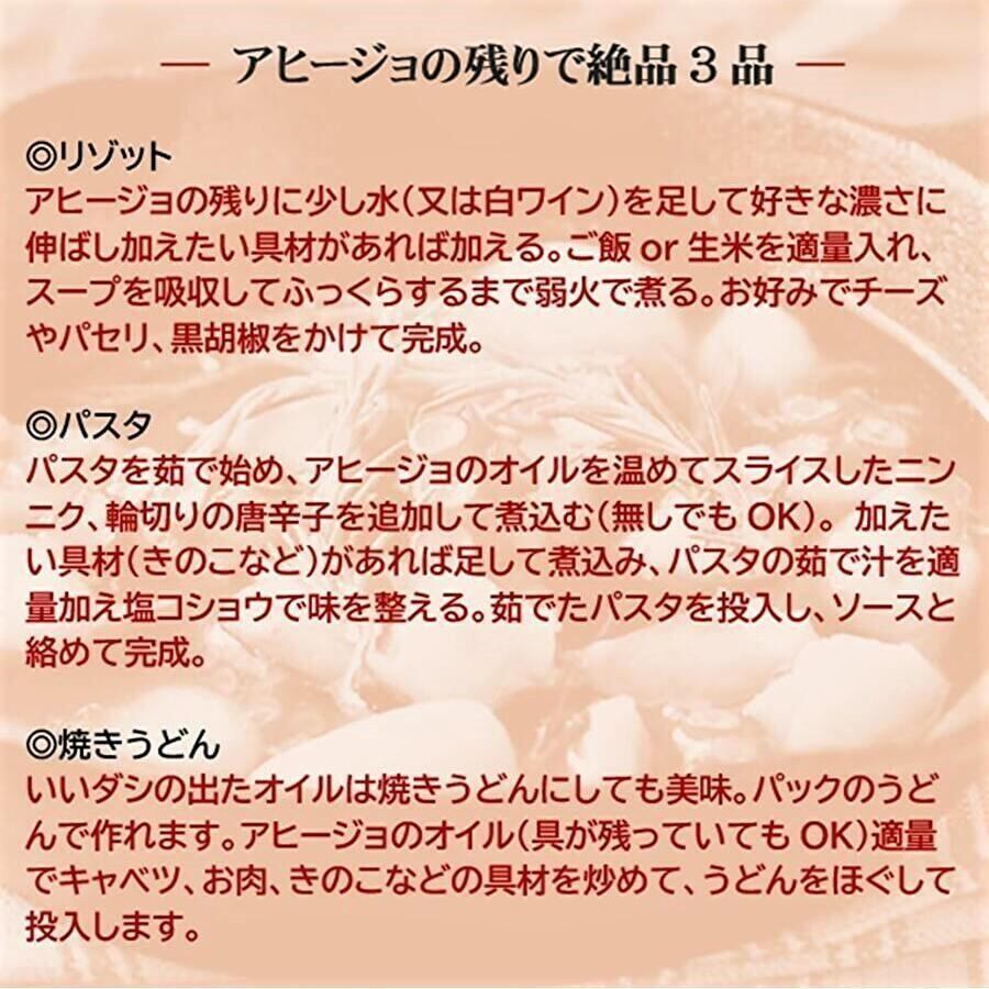原材料:ミズダコ(北海道沖)、オリーブ油、昆布(北海道沖)、おろしニンニク、魚醤粉末、フライドガーリック(乾燥ガーリック、食用こめ油)、食塩、粗挽き黒胡椒、鷹の爪、粉末こしょう