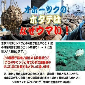 猿払・宗谷産ならではの甘い風味。オホーツクのホタテの特徴は、カゴの中で育てられた運動量の少ない帆立貝と比べると、冷たい海で元気に動き回るため、繊維1本1本が太く、身の締りが良く甘みが増します。
