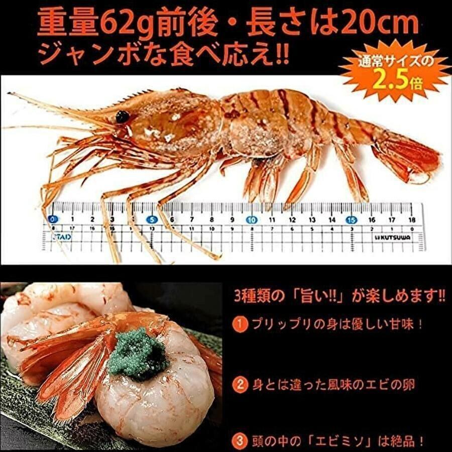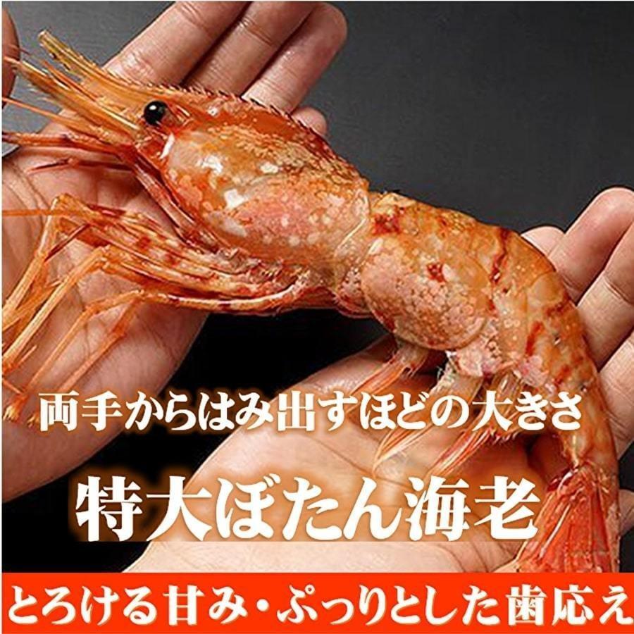 ボタンエビの超特大サイズ。通常サイズの2.5倍もあるジャンボサイズはなかなか手に入りません。獲れたてのボタンエビを船内で急速冷凍しているから抜群の鮮度。プリプリの食感とトロケル優しい甘さが絶品!お刺身や塩焼きでお楽しみください。ボタンエビの身、卵、エビミソが楽しめます。