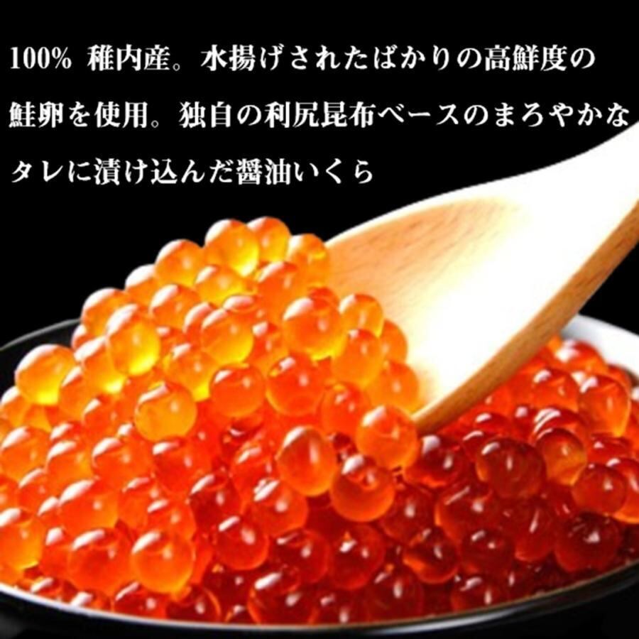 【稚内ブランドに認定】100% 稚内産。水揚げされたばかりの高鮮度の鮭卵を使用。老舗独自の利尻昆布ベースのまろやかなタレに漬け込んだ醤油いくら、製造時の急速冷凍1度限りのワンフローズンいくらです。