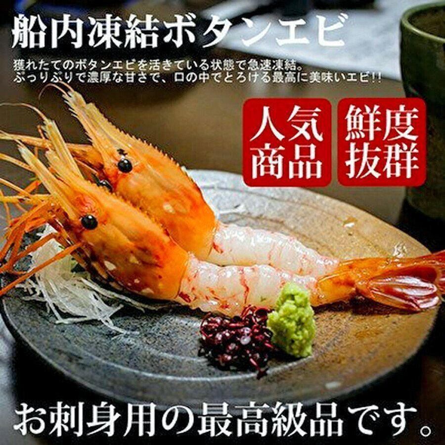 獲れたてのボタンエビを船内で急速冷凍した鮮度抜群のボタンエビ冷たい海域で獲れるボタンエビは甘味が増し、ぷりっぷりの食感です! 北海道の鮨店でも使われているボタンエビです。