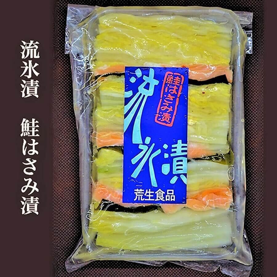 ●鮭はさみ漬 宗谷沖で獲れた新鮮な鮭を1度山漬けし、酢で〆て白菜の間に挟み込みました。甘口の糀漬けです。