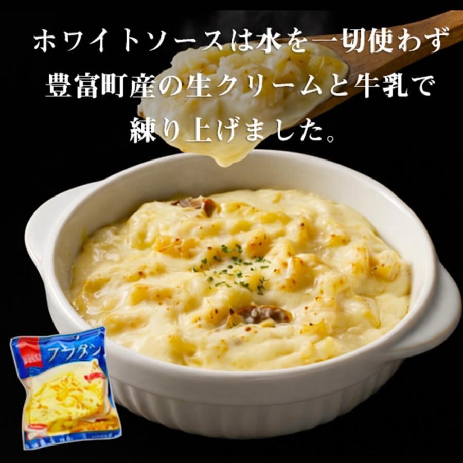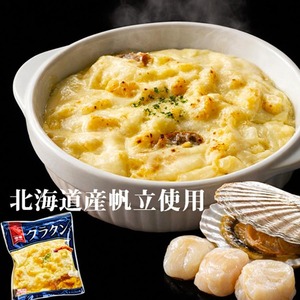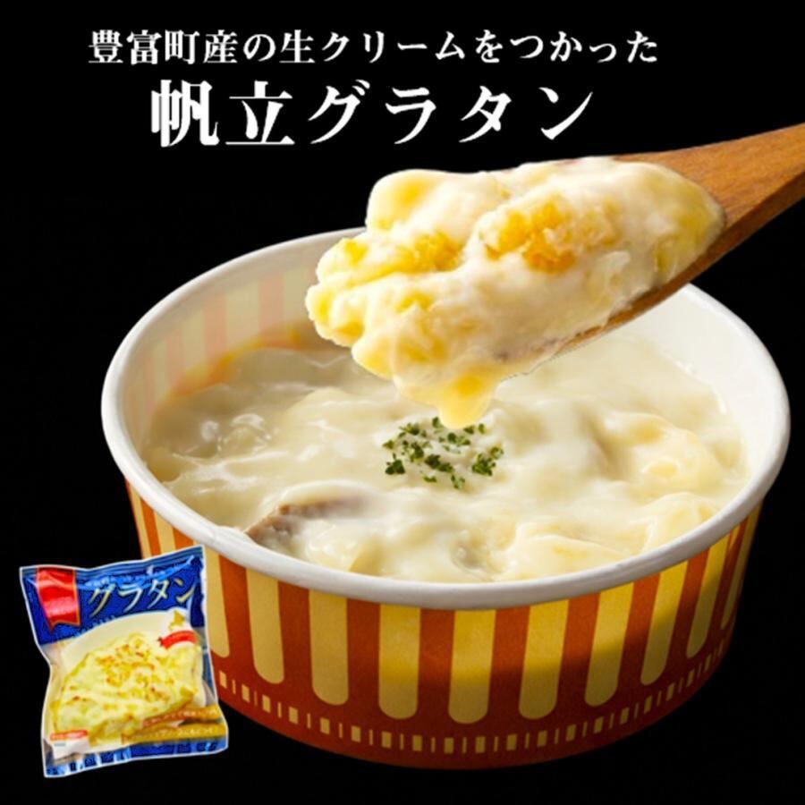 ベシャメルソースには、水を一切使わずに豊富町産の生クリームと牛乳のみで練り上げ具材は宗谷産ほたて貝柱フレークを使用しました。製造工程の全てを手作業にて行ったこだわりのグラタンです。