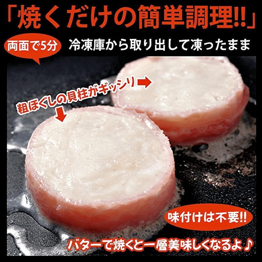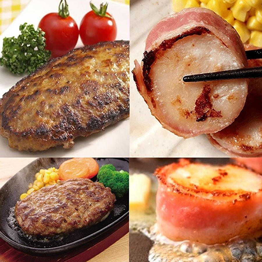 宗谷岬牧場のハンバーグ1枚120g(4枚入パッケージ箱)とホタテステーキ 6枚(1パック)のセットです。宗谷岬牧場のハンバーグは日本最北端の地、宗谷岬の丘陵地帯に広がる牧場で放し飼いにされた牛を原料に製造しています。牛肉、小麦、玉ねぎなど主要原材料は北海道産を使用し、安全・安心にこだわったハンバーグです。たっぷりの肉汁でとってもジュ〜シ〜でソース要らずの美味しさが自慢のハンバーグ新鮮なです。新鮮なホタテの身を粗ほぐしにして、デンマーク産の特製ベーコンで巻き込んでギュッと美味しさを凝縮させた海鮮ステーキです。食べるとジュワ〜っと染み出す素材の味がたまらなく美味しいです。