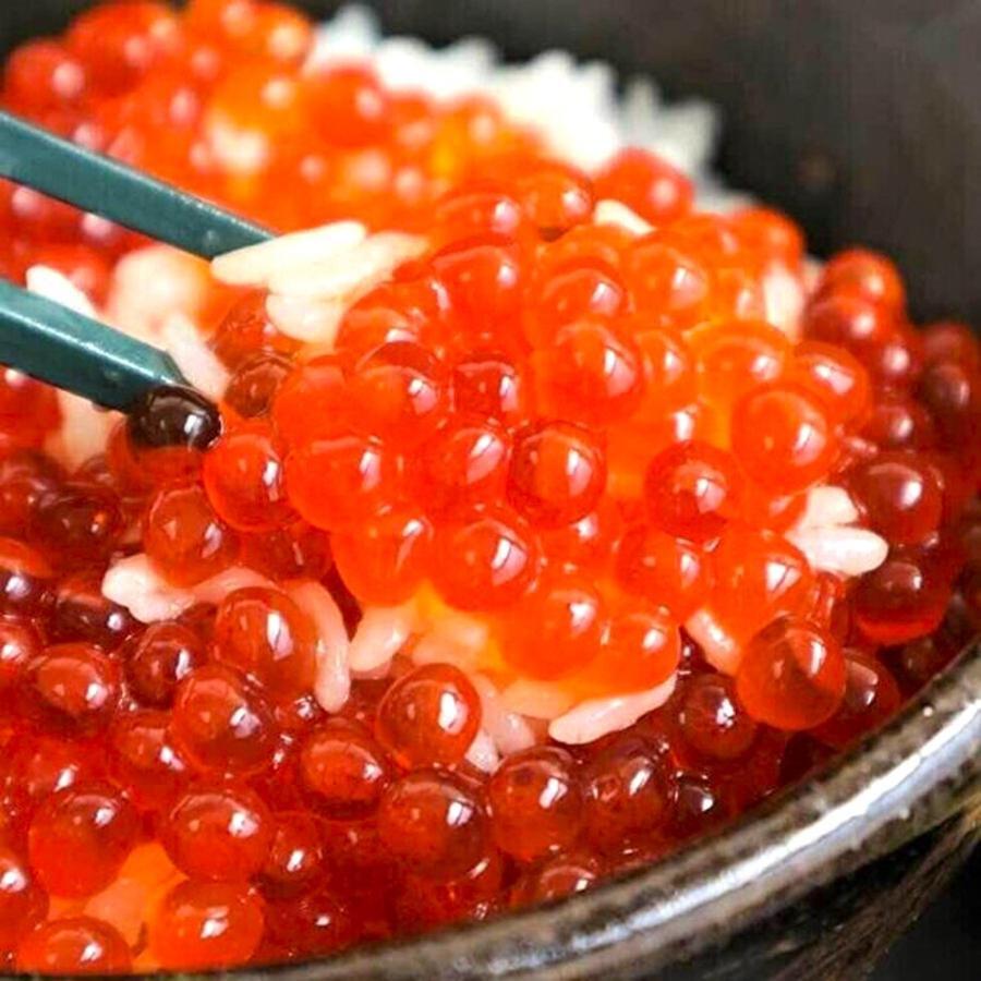 鮭いくら醤油漬200g(化粧箱入り)×1箱は、純粋知床産の新鮮ないくらを使用し、特製の昆布醤油液で時間をかけて漬け込んで作られています。保存料や着色料は使用しておらず、後味が優しい味わいとなっています。純粋な自然を感じることができ、鮮度が命であるいくらを最高の状態で味わうことができます。