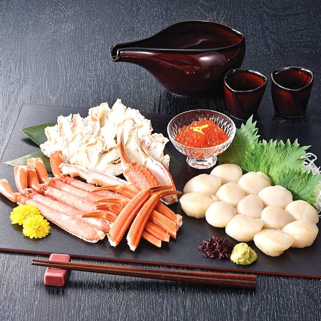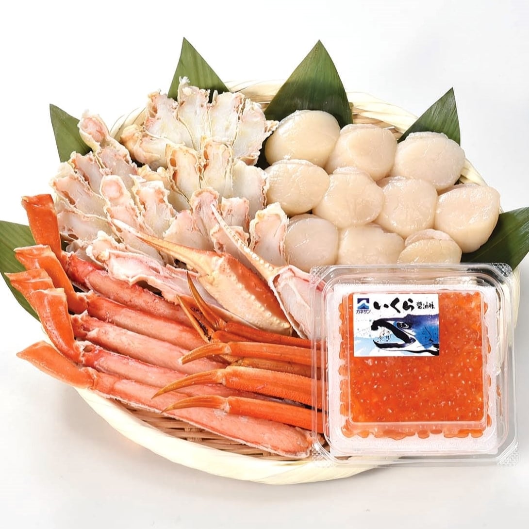 北海道の刺身用ほたて貝柱といくら醤油漬けをセットにいたしました。ボイルずわいがにも一緒にご賞味下さい。