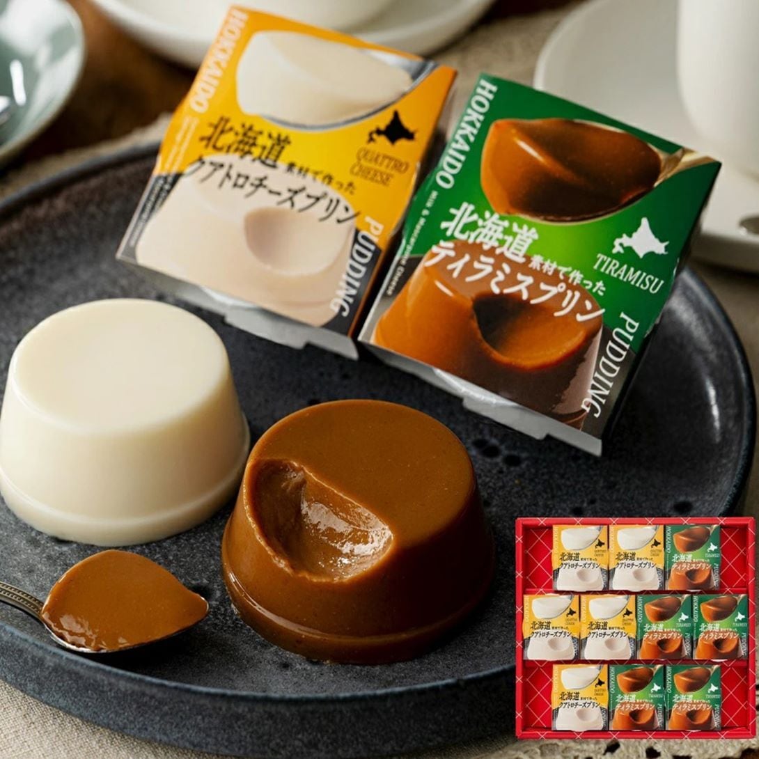 北海道産の素材を使ったギフトセット。 クアトロチーズプリンは、北海道産クリームチーズ・マスカルポーネ・カマンベール・カッテージチーズの4種類のチーズを使用。 チーズの濃厚な風味とコクを感じられ、甘さと酸味のバランスが良くクリーミーな食感のプリンです。 ティラミスプリンは、北海道産マスカルポーネと牛乳を使用。大人な甘さにコーヒーエキスの程よい苦みがアクセント。 北海道の素材を活かしたまるでティラミスのような深みのある味わいをお楽しみいただけます。