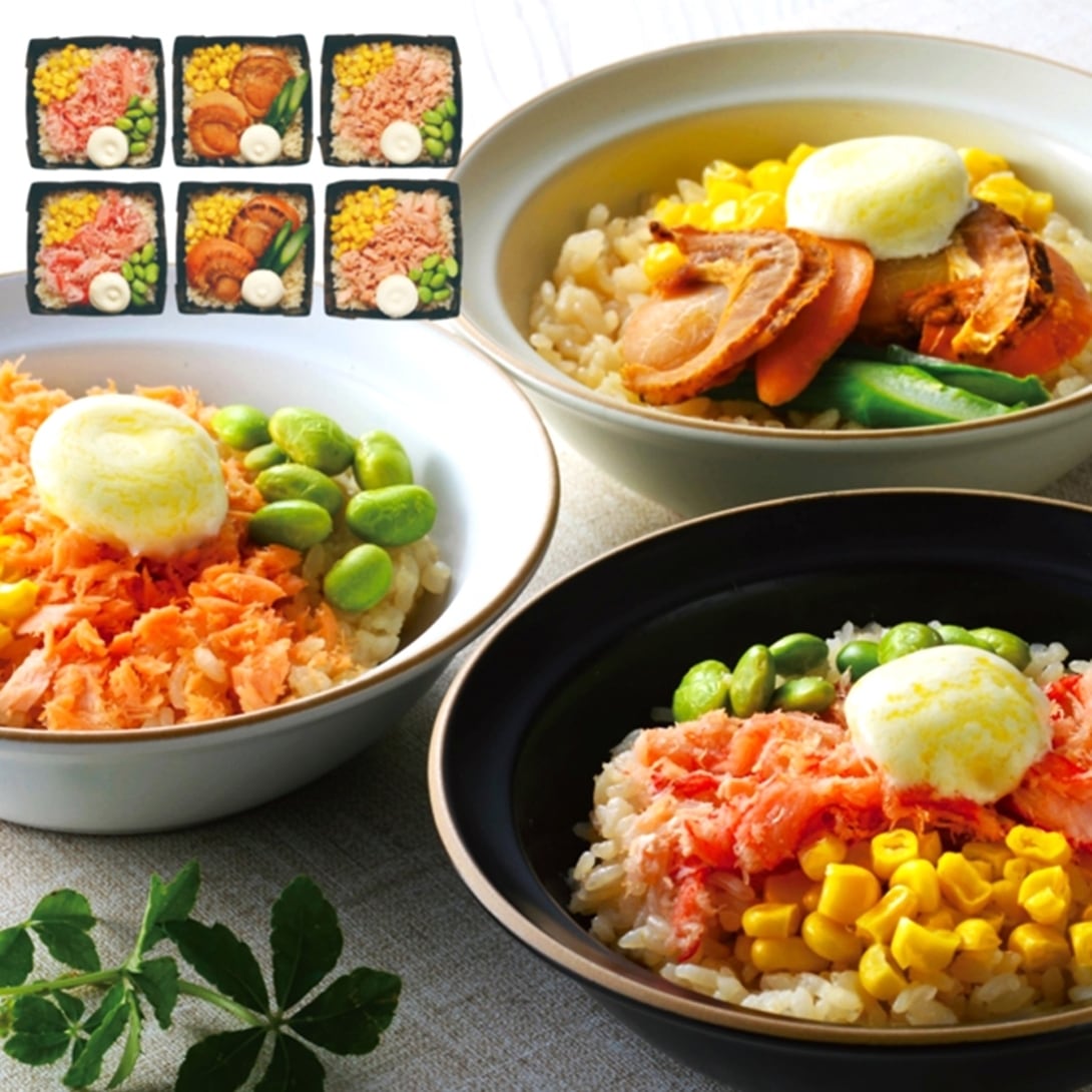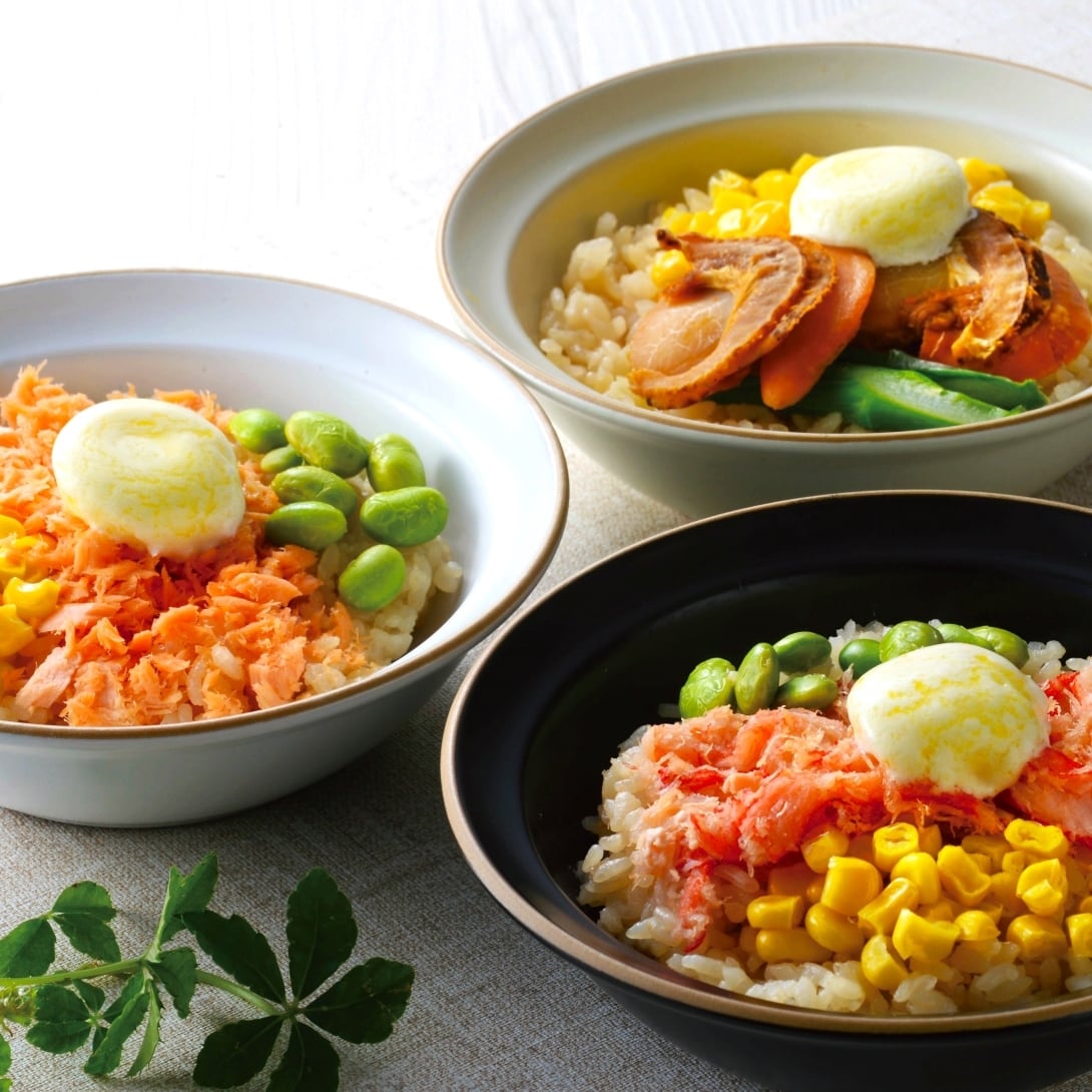 内容:帆立バターコーン飯150g・紅ずわい蟹バターコーン飯・鮭バターコーン飯 各130g×各2