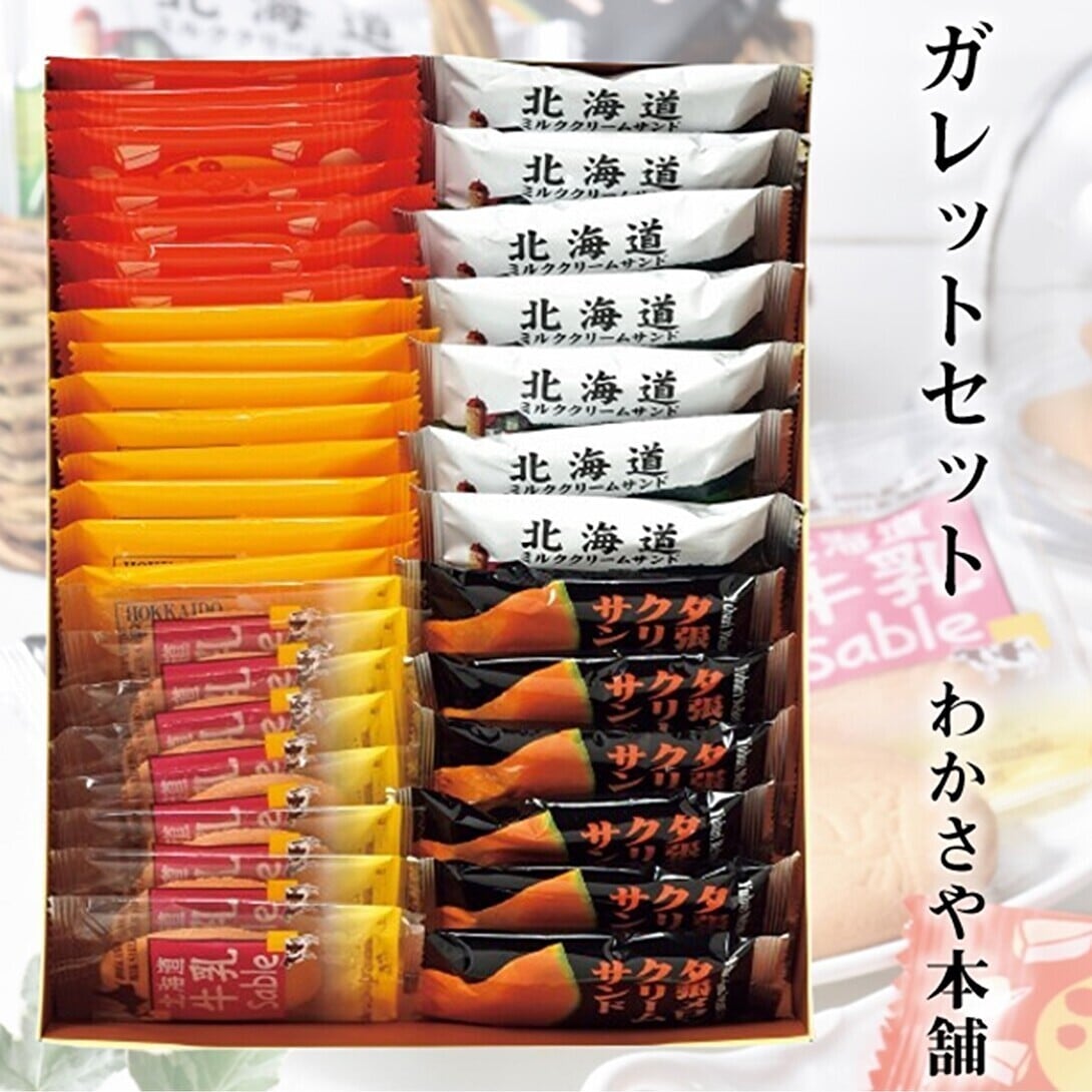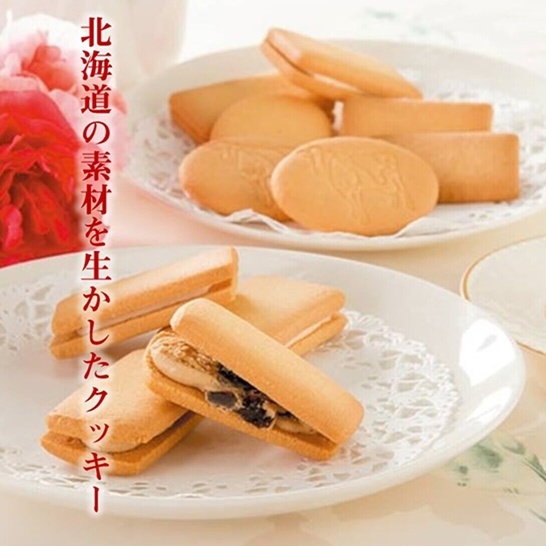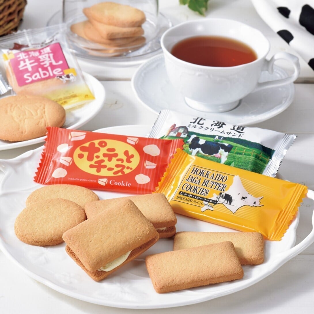 ・内容量:北海道ミルククリームサンド/6枚、じゃがバタークッキー/10枚、夕張メロンクリームサンド・北海道バターリッチ・ポテっとチーズ・牛乳サブレ/各5枚