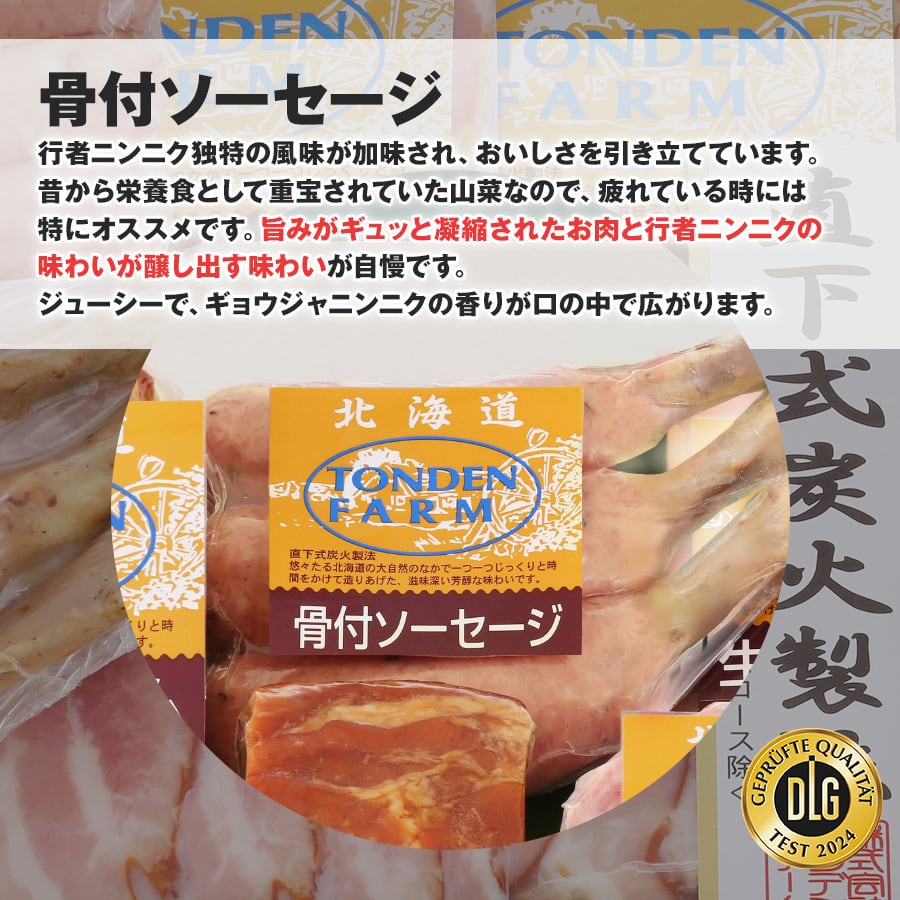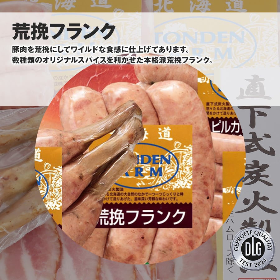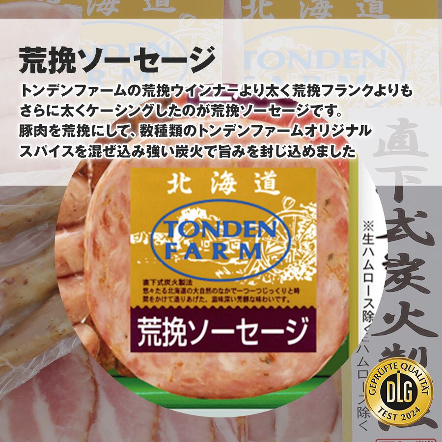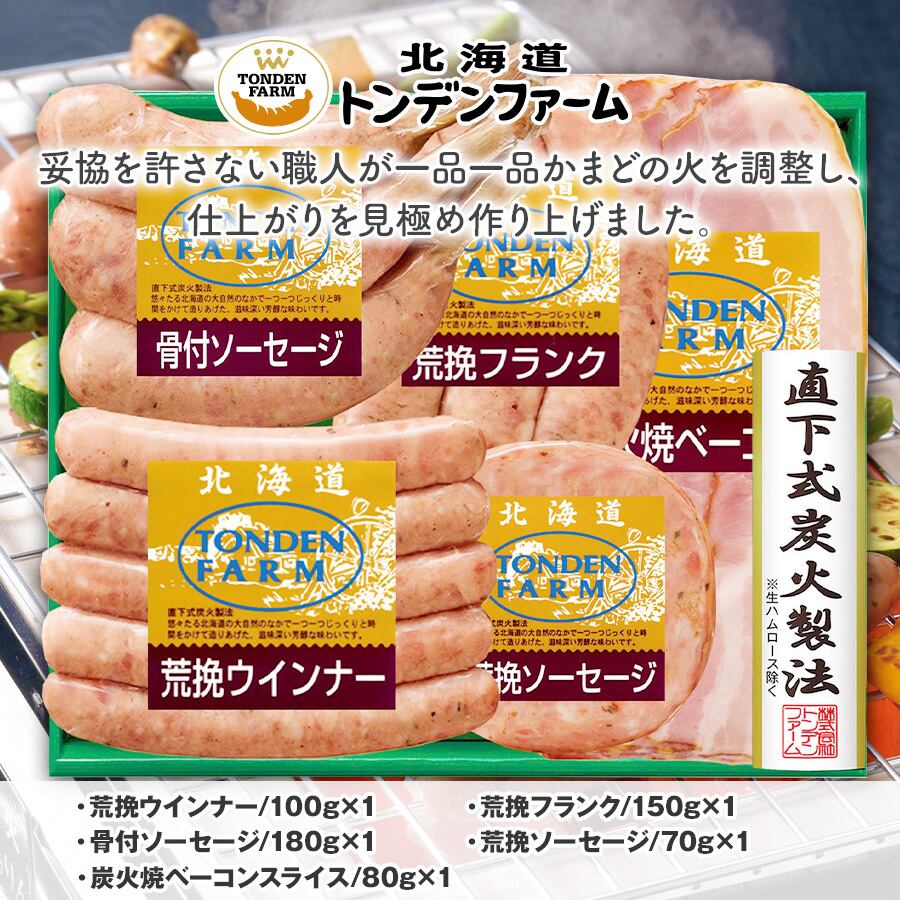 特徴 トンデンファームのこだわりの一つは、炭火を使って行う乾燥の工程。ガスや電気に比べ炭火で炙ると、肉の表面にすばやく熱が伝わるので、旨味成分を増す働きがあります。強い炭火で旨味を封じ込めた後は、残り火を利用してじっくり燻す燻煙の工程。この工程で肉に独特の深い香味が加わります。味・製法に妥協を許さない職人が一品一品かまどの火を調整し、出来上がりを見極め直下式炭火製法にて作り上げた詰め合わせです。
