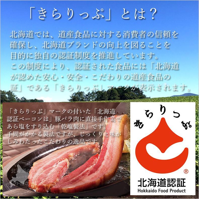 北海道認証ベーコンは水を使わずに直接手作業であら塩をすり込む「乾塩製法」で製造しており、じっくり味がしみたこだわりの逸品です。