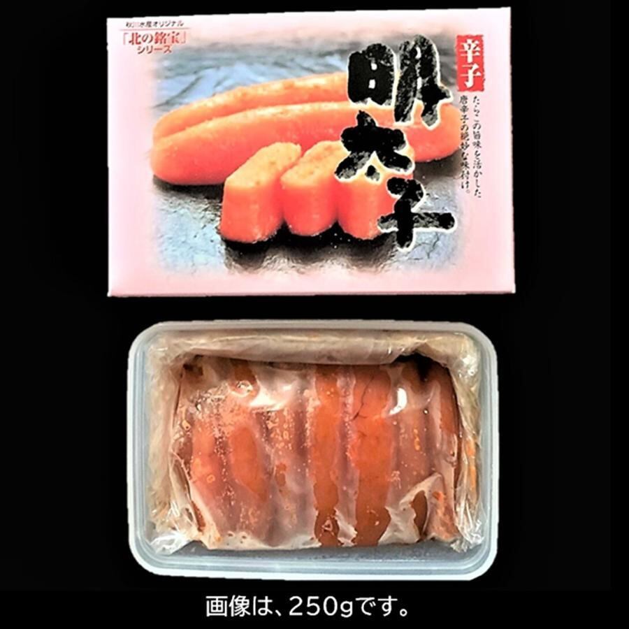 北海道近海で獲れる新鮮なスケソウダラ から丁寧に取りだされた見事な『たらこ』を 原料に心を込めて提供する味の逸品です。特製調味液で本格熟成させた、最北の 辛子明太子は、厳寒の海が育てたまろや かな味わいです。