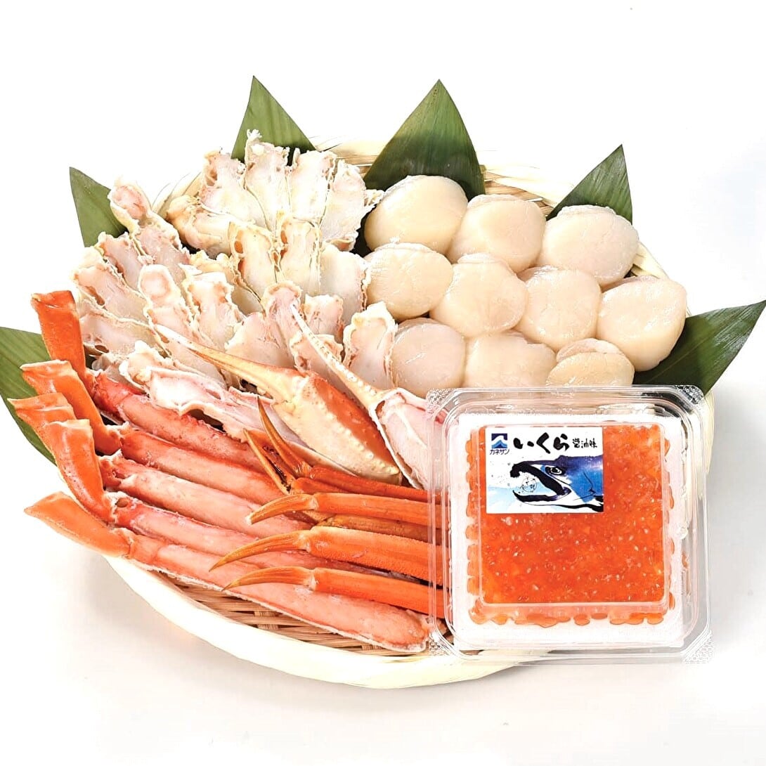 ット内容 ボイルずわいがにハーフポーション(グリーンランド産)/400g、ほたて貝柱(北海道産)/200g、いくら醤油味/40g