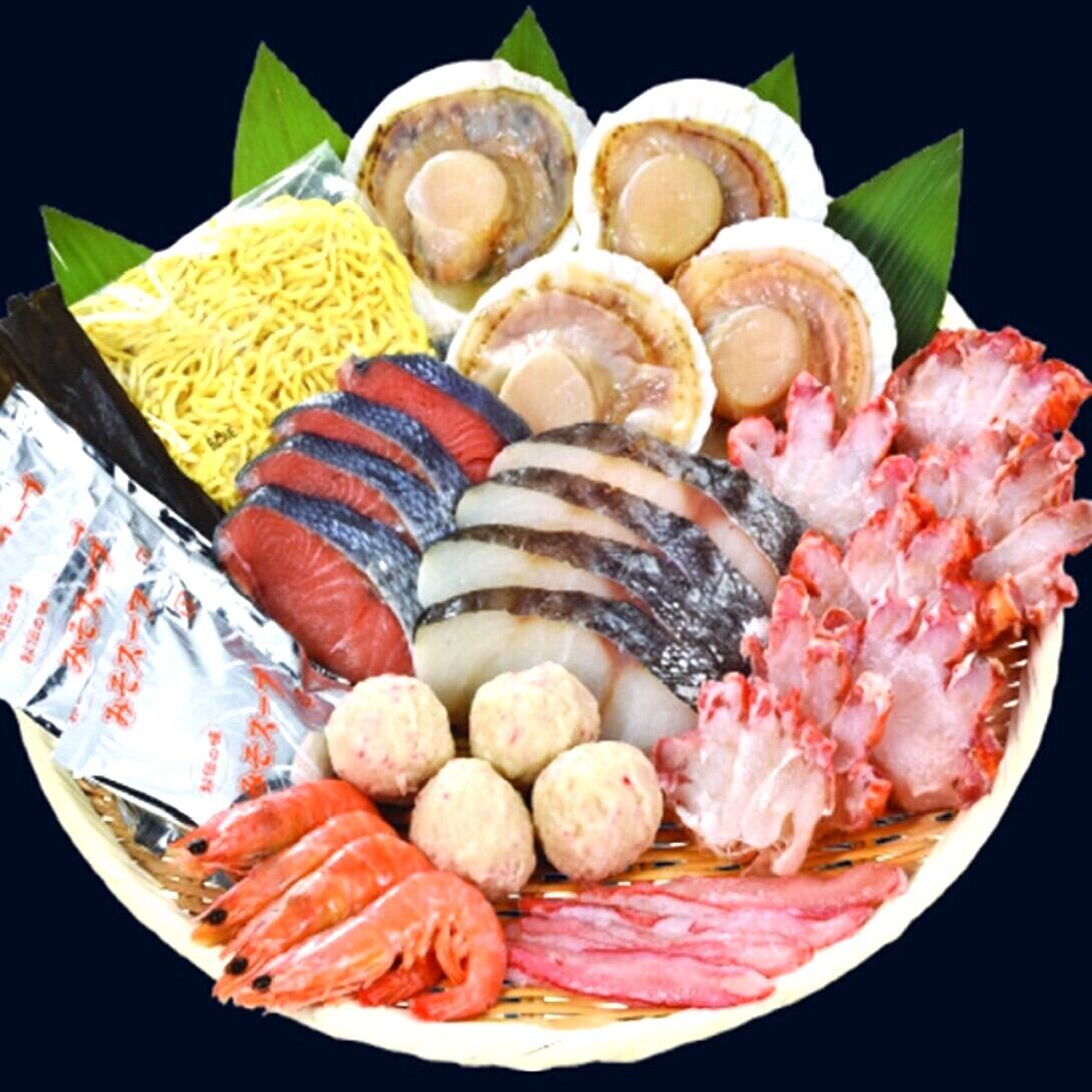 商品内容 ■生紅ずわいがに(北海道産)/180g、秋鮭・真だら(北海道産)/各4切(120g)、かに入りつみれ/4個(100g)、ボイルえび(バナメイ)/4尾、ほたて片貝(北海道産)/4枚、ラーメン/110g、だし昆布/2枚、みそスープ/48g×4