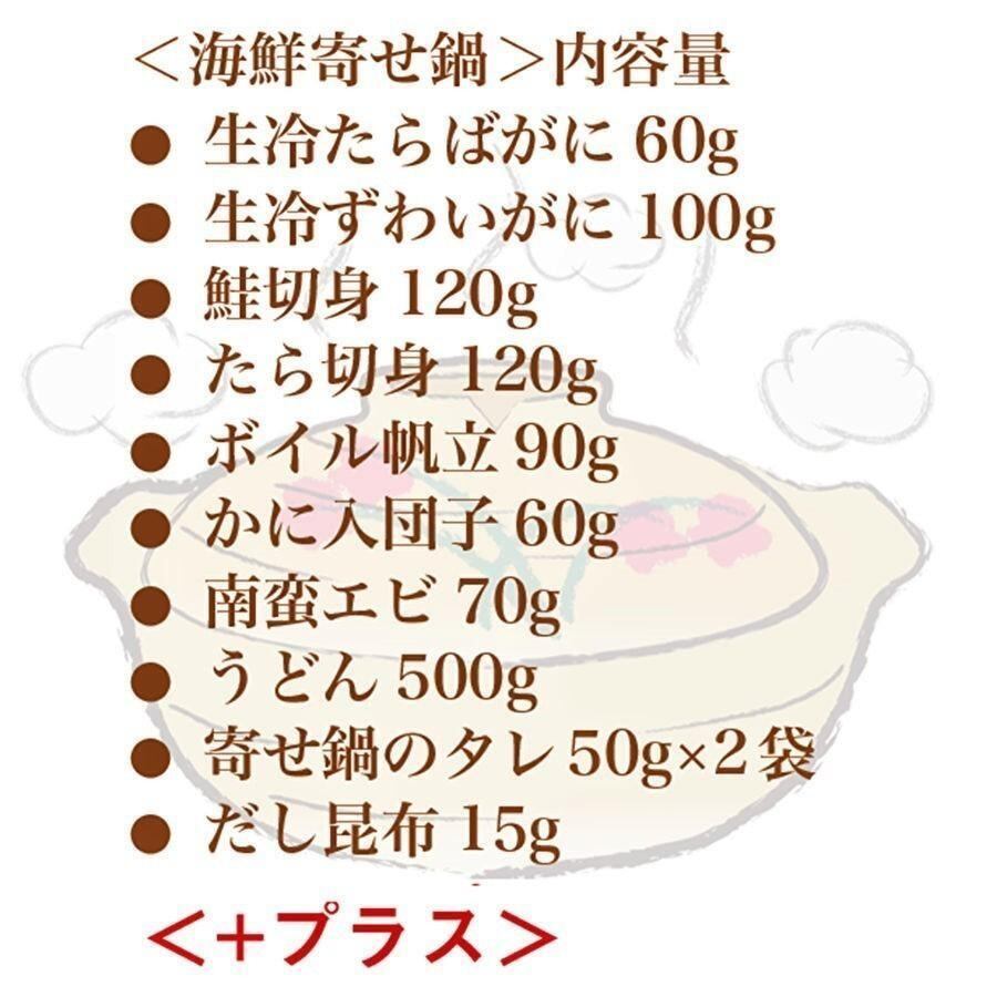 ◎生冷タラバガニ60g・生冷ズワイガニ100g・甘えび70g・鮭切り身120g・たら切り身120g・ボイルほたて90g・カニ入り団子60g・うどん500g・寄せ鍋のタレ2袋・出汁昆布