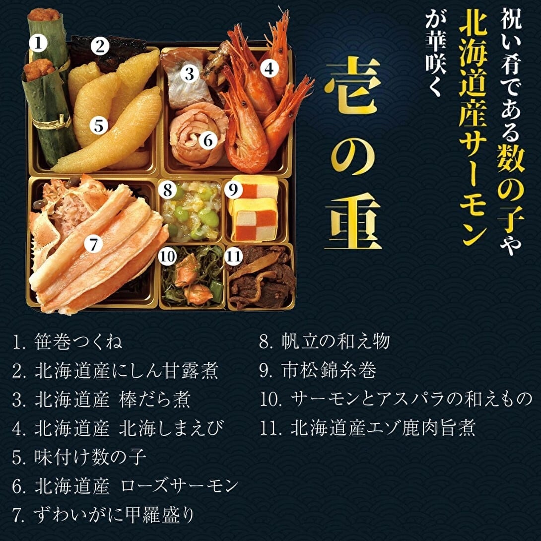味付け数の子/4本,笹巻つくね/2本,北海道産にしん甘露煮/2切れ,北海道産棒だら煮/3切れ,北海道産ローズサーモン/1個,北海道産北海しまえび/4尾,ずわいがに甲羅盛り/1個,サーモンとアスパラの和えもの/26g,市松錦糸巻/2個,帆立の和え物/26g,北海道産エゾ鹿肉旨煮/26g